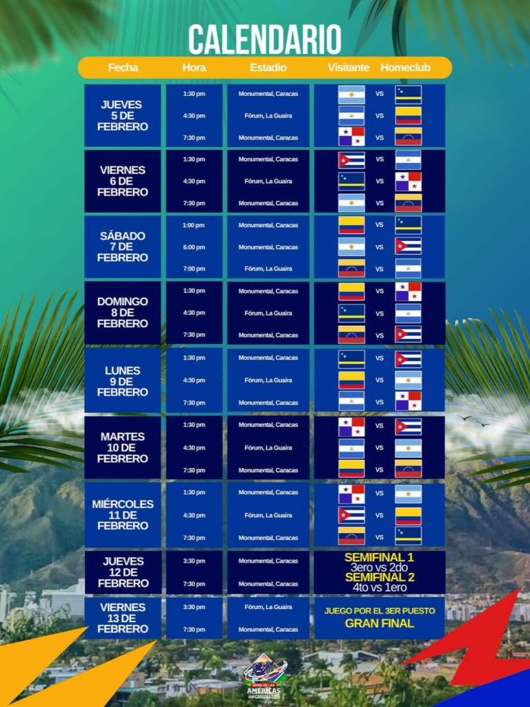 El juego por el tercer lugar se celebrará el 13 de febrero en Macuto, a partir de las 3:30 pm, salvo que esté involucrada Venezuela. En ese caso, el encuentro se trasladará al Monumental.